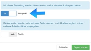 Aus diesem Grund bietet der Excelexport nun die Option "Kompakt" an. Bei dieser Einstellung wird für eine Frage nur eine Spalte verwendet und die Antworten werden direkt in diese Spalte geschrieben.