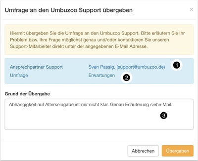 Umfragen können nun an den Umbuzoo Support übergeben werden. Damit können wir noch einfacher und schneller bei Problemen oder Fragen unterstützen.