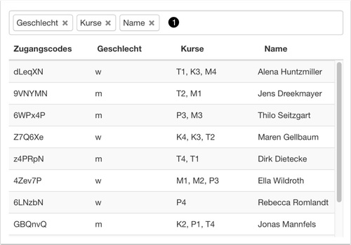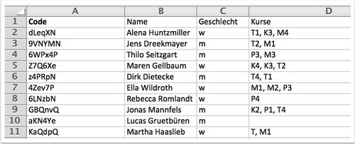 Zu Beginn erzeugt man über (1) zunächst eine Beispieldatei und ergänzt die Codes mit Informationen zu den Befragten. Hier beispielhaft um Name, Geschlecht und die belegten Kurse einer Veranstaltung ergänzt: