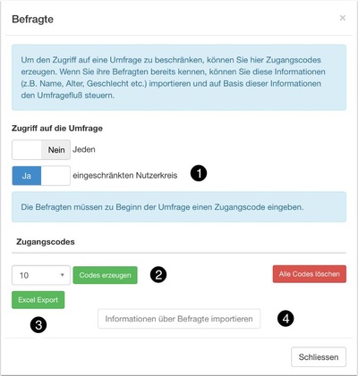 Um den Zugriff auf eine Umfrage mit Codes zu schützen, muss dieser auf einen "eingeschränkten Nutzerkreis" (1) umgestellt werden. Nach dem Erstellen der individuellen Zugangscodes (2) können diese als Exceldatei heruntergeladen werden (3), um sie in andere Systeme zur Weitergabe (z.B. Mailprogramm) zu importieren. In unserem Fall hat der Kunde die Codes einfach auf Aufkleber gedruckt und diese auf Briefe geklebt.