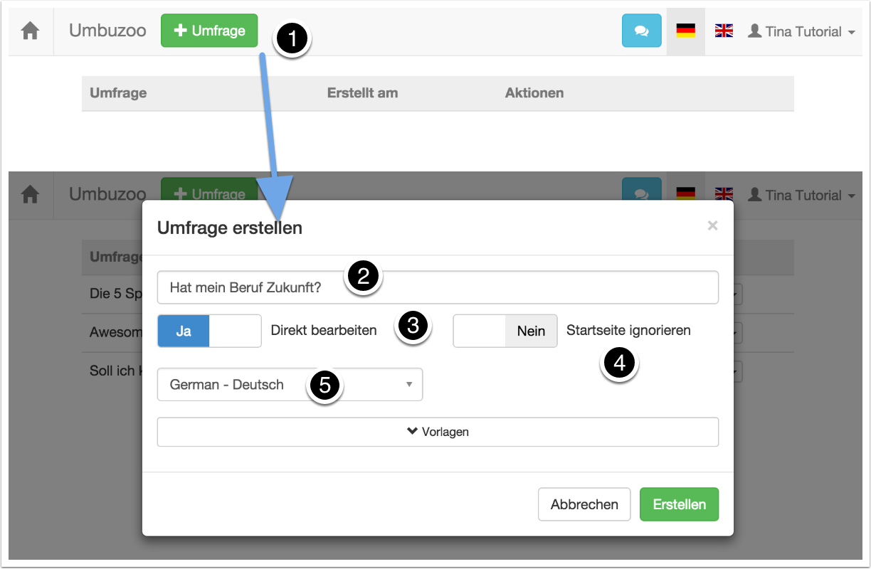 Eine Umfrage wird in Umbuzoo in der Übersichtsseite hinzugefügt (1).
