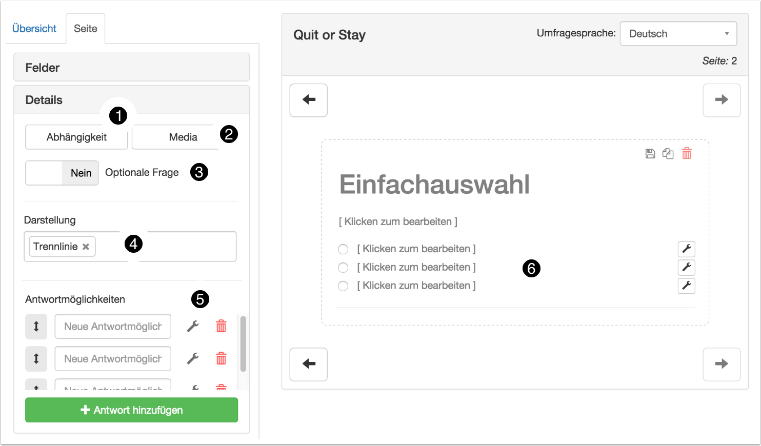 | 3 | Öffnet die Umfrage nach dem Anlegen sofort für die Bearbeitung. |