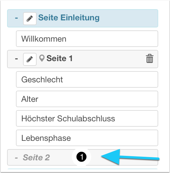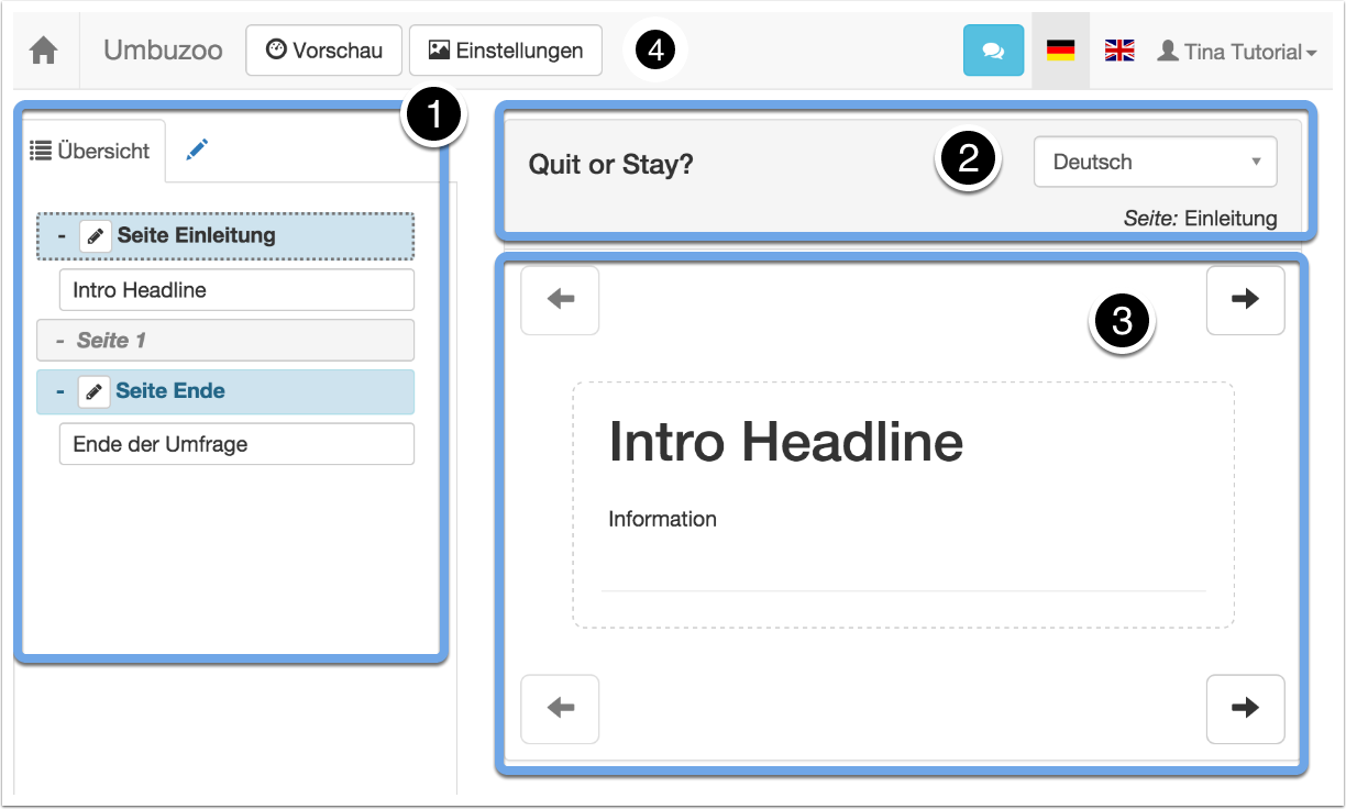 | 1 | Aufbau und Inhalte | In der Übersicht (Dokumentenbaum) wird die Reihenfolge der Seiten und Fragen angezeigt. Diese lassen sich hier verschieben. Unter Seite können die eigentlichen Eingabeelemente in die Umfrageseiten eingefügt und bearbeitet werden. |