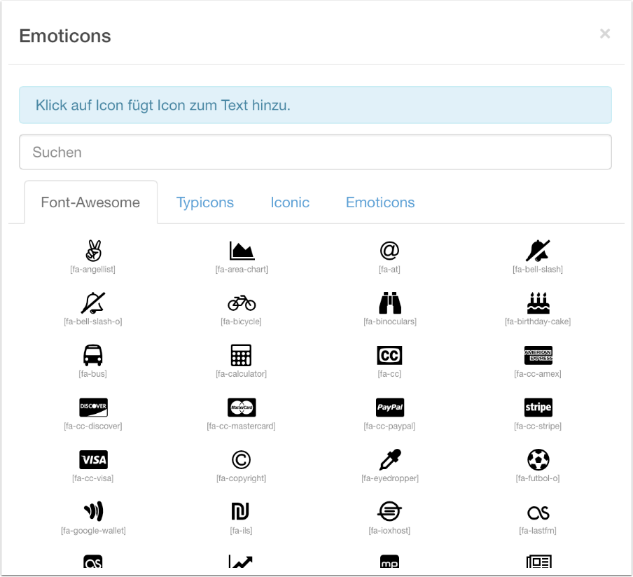 In Umbuzoo werden zur Zeit 4 Icon-Sets unterstützt (Font-awesome, Typicons, Iconic und HipChat Emoticons). Die Iconsets von font-awesome, typicons und Iconic sind vectorbasiert und sehen daher in allen Auflösungen und Größen immer perfekt aus. Font-awesome und Typicons passen sich entsprechend der Schriftgröße des Textes an. Die Icons von Iconic können in einer dreifachen Abstufung (klein, mittel, groß) dargestellt werden.