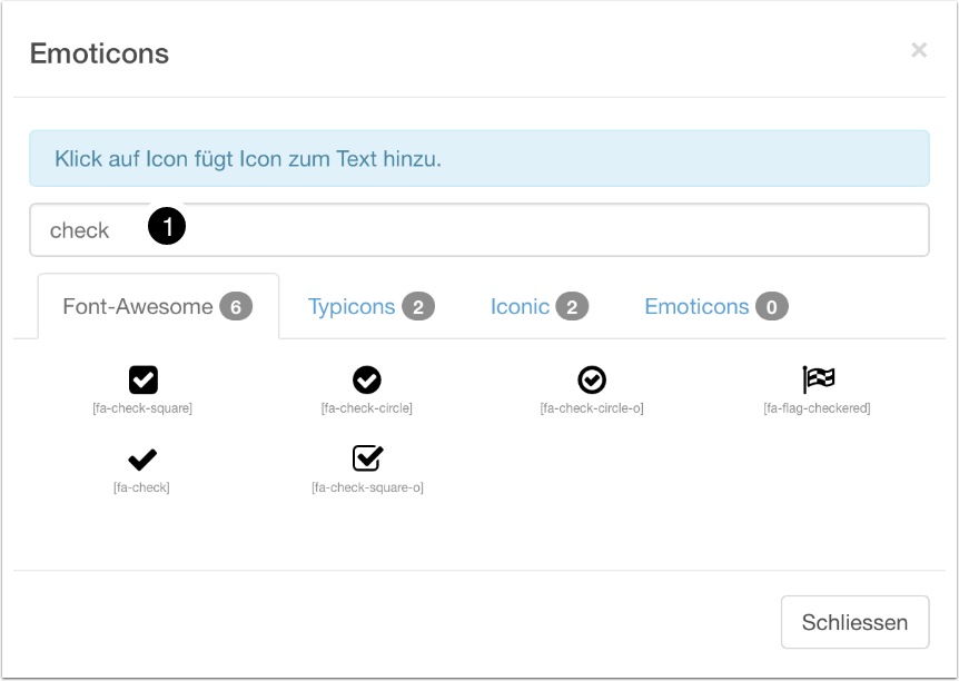 Über die Suche (1) kann Iconset-übergreifend gesucht werden (gesucht wird in den englische Bezeichnung des Icons, Beispiel Suche nach “check”):