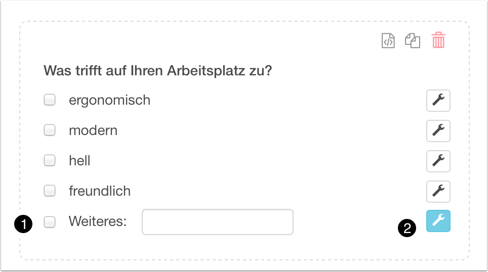 Das letzte Element (1) erlaubt eine zusätzliche freie Eingabe. Das hervorgehobene Settings-Symbol (2) zeigt an, dass für diese Eingabe weitere Einstellungen vorgenommen wurden. Die Einstellungen werden bei Auswahl des Settings-Buttons angezeigt: