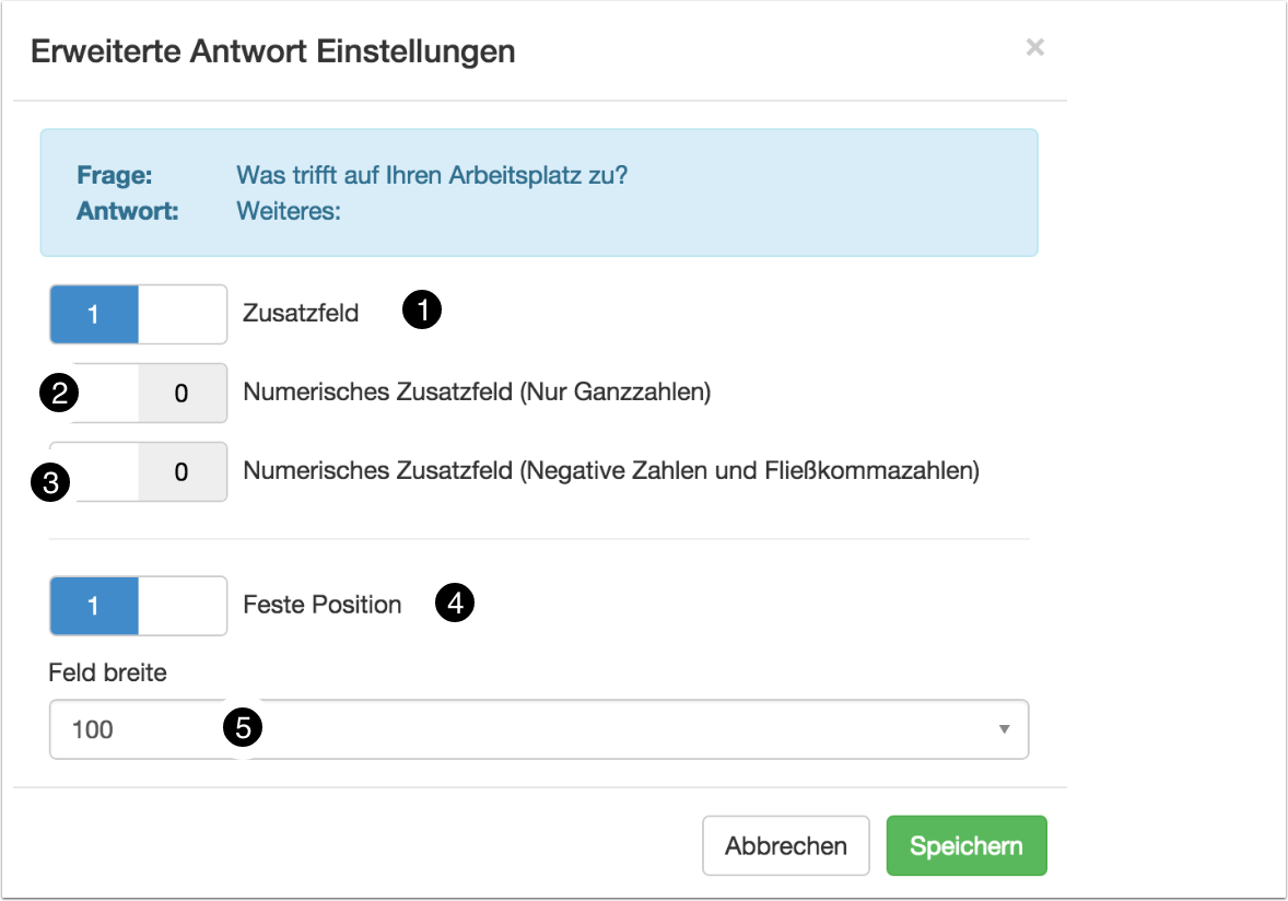 Die Antwortmöglichkeiten von freien Eingaben können über die erweiterten Einstellungen (1) eingeschränkt werden: