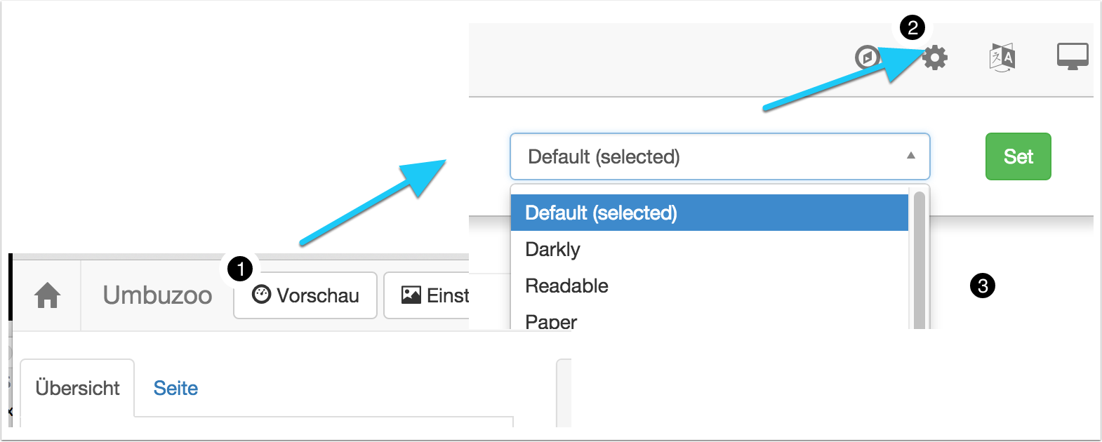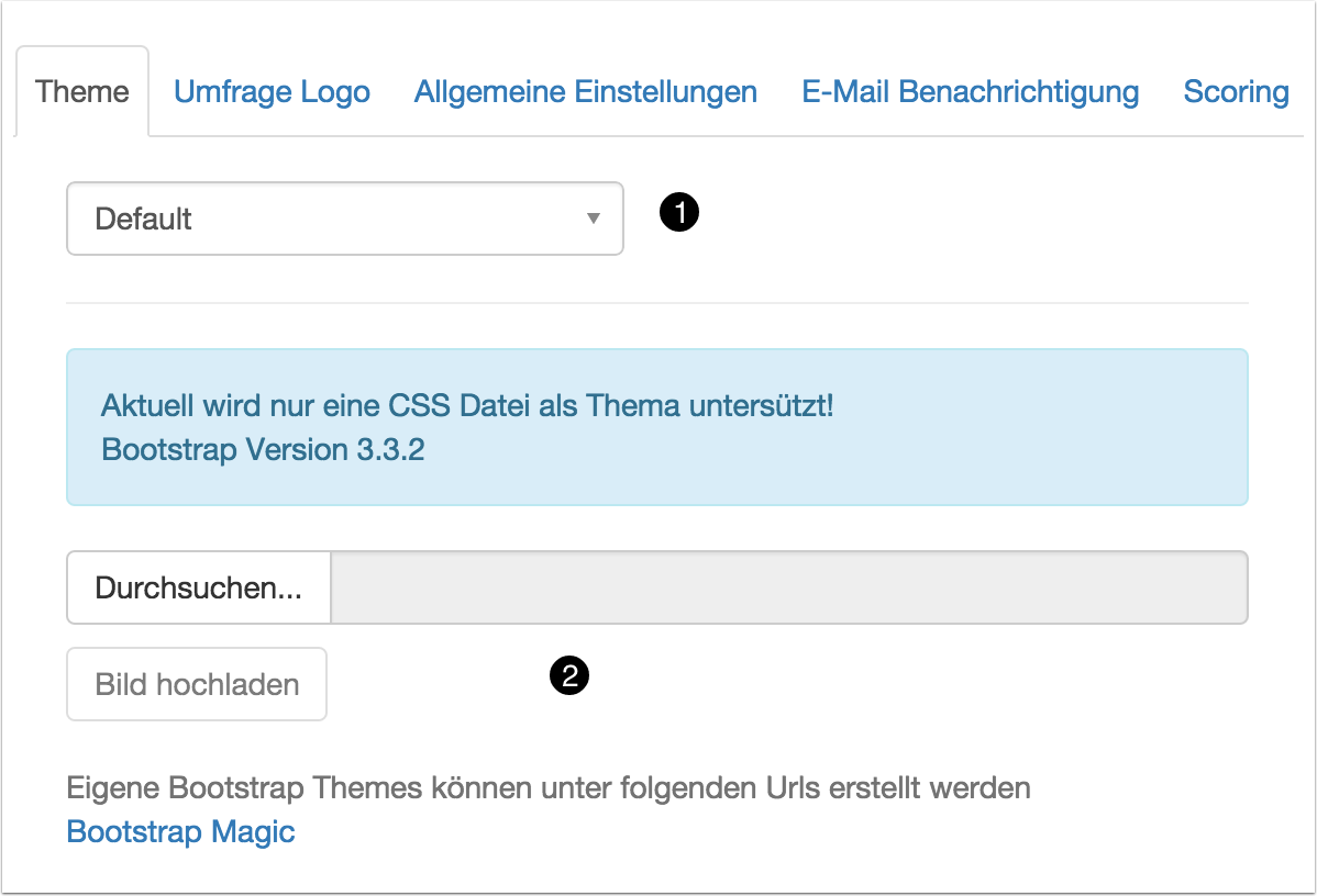 Das CSS-Theme der Auswertung. Hier kann eine der vordefinierten bootswatch Themen ausgewählt werden (1). Alternativ kann auch ein selbst definiertes CSS-Theme hochgeladen werden (2). Hiermit lassen Umfragen individuell an die Styleguides einer Corporate Identity anpassen. Das Thema kann auch in der Voransicht der Umfrage ausgewählt und geändert werden: