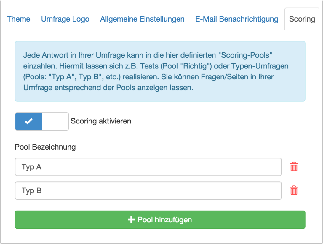 Mit Hilfe des sog. “Scroring” können Anworten bewertet werden. Hiermit lassen sich z.B. Tests und Typenumfragen durchführen. |
