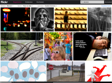 | Bei den Suchanfragen sollte man englische Begriffe nutzen (Übersetzung über z.B. LEO). Der Begriff “decision” (Entscheidung) liefert bei Flicker z.B. die nebenstehenden Ergebnisse. |